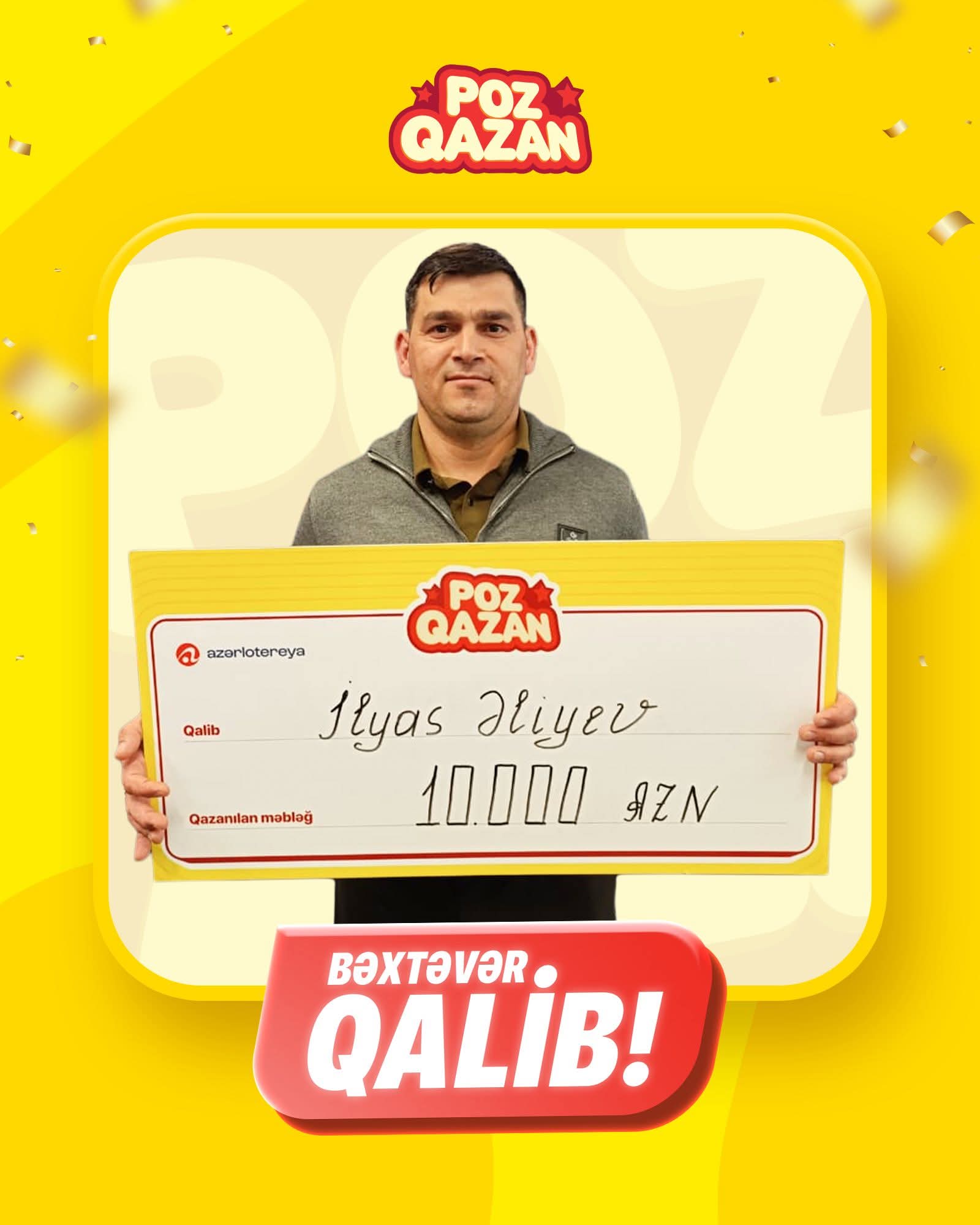 “Uğurlu 7″nin uğur gətirdiyi növbəti qalib Ordubad sakini İlyas Əliyev oldu. Rayonun Düylün kəndində yerləşən poçt bölməsindən aldığı 1 ədəd “Uğurlu 7” bileti ona 10 000 manat qazandırdı. Təbrik edirik.