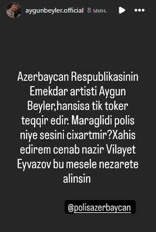 “Aygün Bəyləri hansısa tiktoker təhqir edir. Xahiş edirəm, məsələ nəzarətə alınsın”.