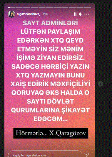 “Xəbər paylaşarkən lütfən XTQ qeyd etməyin. Siz işimə ziyan edirsiniz. Sadəcə hərbçi yazın, XTQ yazmayın. Xahiş edirik ki, məxfiliyi qoruyaq, əks halda o saytı dövlət qurumlarına şikayət edəcəyəm.