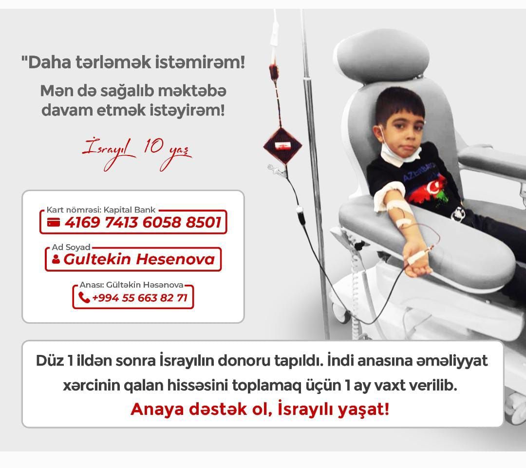 “İsrayılın xəstəliyi anadangəlmə olub amma hiss etməmişik. 7 yaşından üzə çıxmağa başlayıb. İndi Türkiyədə donur tapılıb. Bir ay da vaxt qoyulub. Bununla bağlı hər yerə müraciət edirəm, vaxt çox azdır.