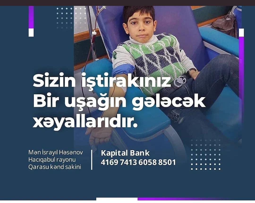 Editor.az xəbər verir ki, Hacıqabul rayonu Qarasu kənd sakini 10 yaşlı İsrayıl Həsənov talassemiya xəstəliyindən əziyyət çəkir.