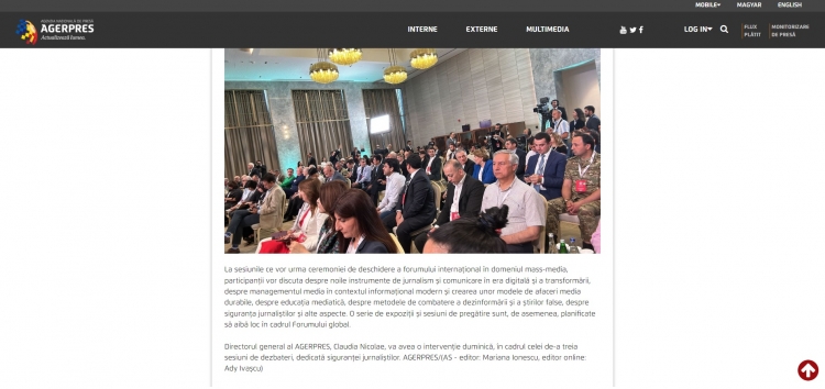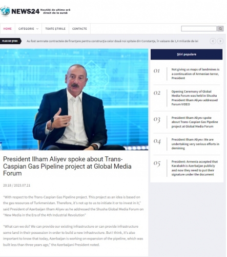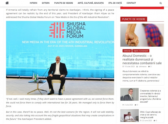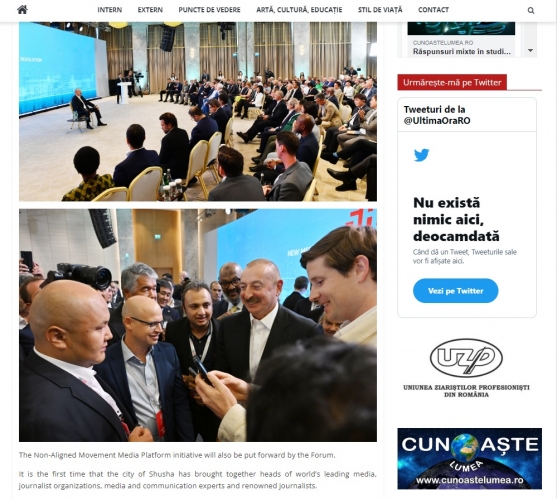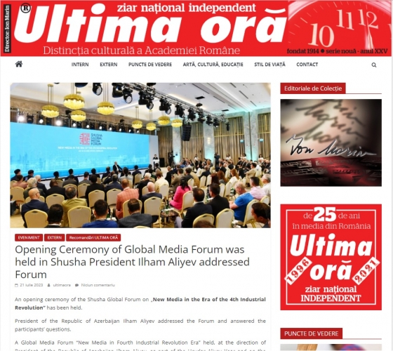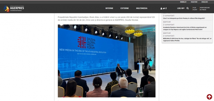 Rumıniyanın nüfuzlu KİV-ləri, “AGERPRES” milli xəbər agentliyi, “Ultima ora” qəzeti, “news24hours” xəbər portalı və bunlara istinadən digər KİV-lər Şuşa şəhərində keçirilən Qlobal Media Forum barədə davamlı məqalələr, videolar yayıb.