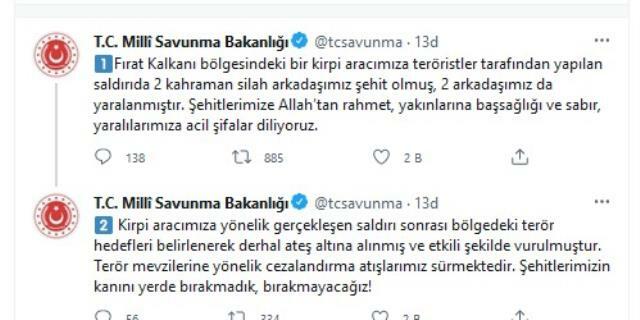 Bildirilib ki, ötən gün baş verən terror aktında Türkiyə ordusunun 2 hərbçisi şəhid olub, daha ikisi yaralanıb.