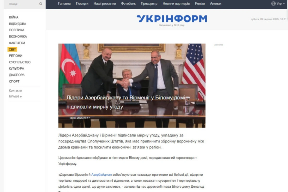 Ukraynanın nüfuzlu media orqanları Azərbaycan Prezidenti İlham Əliyevin və Ermənistanın baş naziri Nikol Paşinyanın ABŞ Prezidenti Donald Trampın dəvəti ilə Vaşinqtonda keçirilən görüşü və əldə olunan mühüm razılaşmaya geniş diqqət ayırıb.